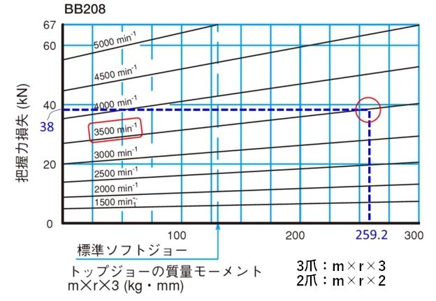 図の例ではBB208でトップジョーの質量モーメントが259.2kg・mmで回転数3500min−1のとき、 把握力損失は38kNとなる。