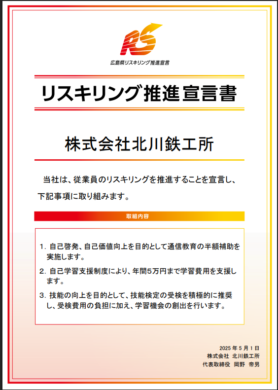 当社は広島県のリスキリング推進の趣旨に賛同し、社員の学びに対してより自由で広範囲な支援を行うため「リスキリング推進宣言書」を策定しました。