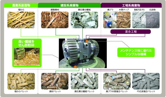 フラットダイ方式特有のローラー回転時のせん断、すり潰し作用により、廃プラ・汚泥などを配合した複合ペレットの製造が容易