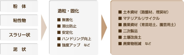 造粒固化することにより、焼却灰・無機汚泥・建設汚泥・ダスト・スラッジなどの、再資源化を実現