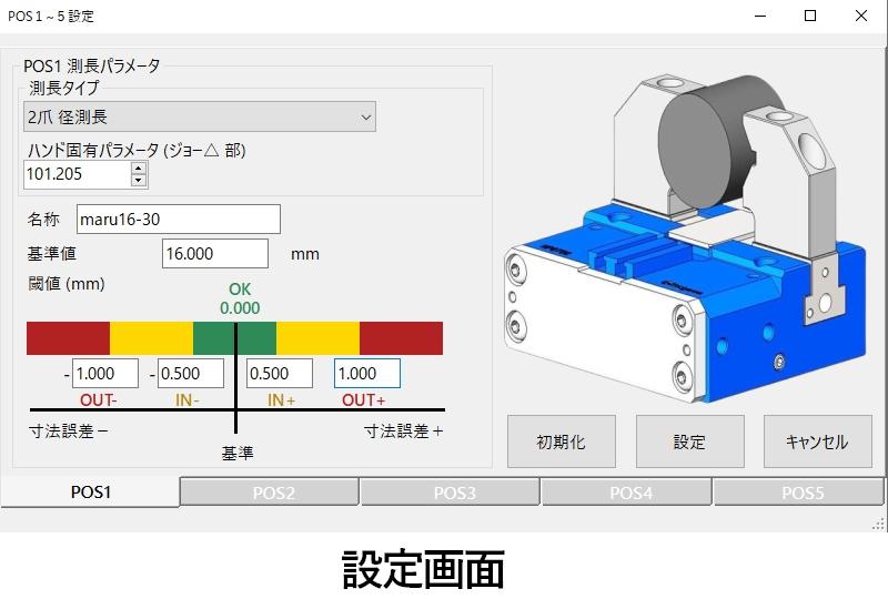 機能 | ・スケール信号の数値変換 (Pulse → mm) ・ジョーの形状を考慮したワーク寸法変換演算 (V形状2爪外径測長、3爪内径測長) ・測長点数:5ポジション (POS1 ~ 5) ・5段階判定出力 (OK / IN+ / IN- / OUT+ / OUT-) ・測長データ (測長履歴) 保存 | ||