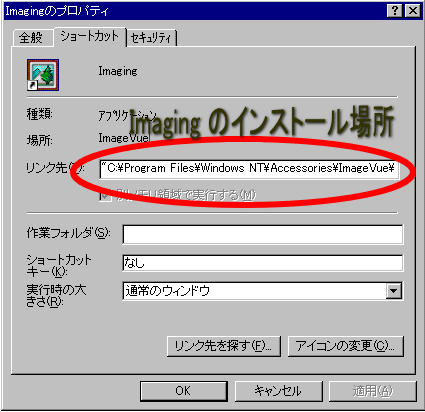 スタート→プログラム→アクセサリ→Imagin にマウスカーソルを重ねマウスの右ボタンを クリックでプロパティを表示する。