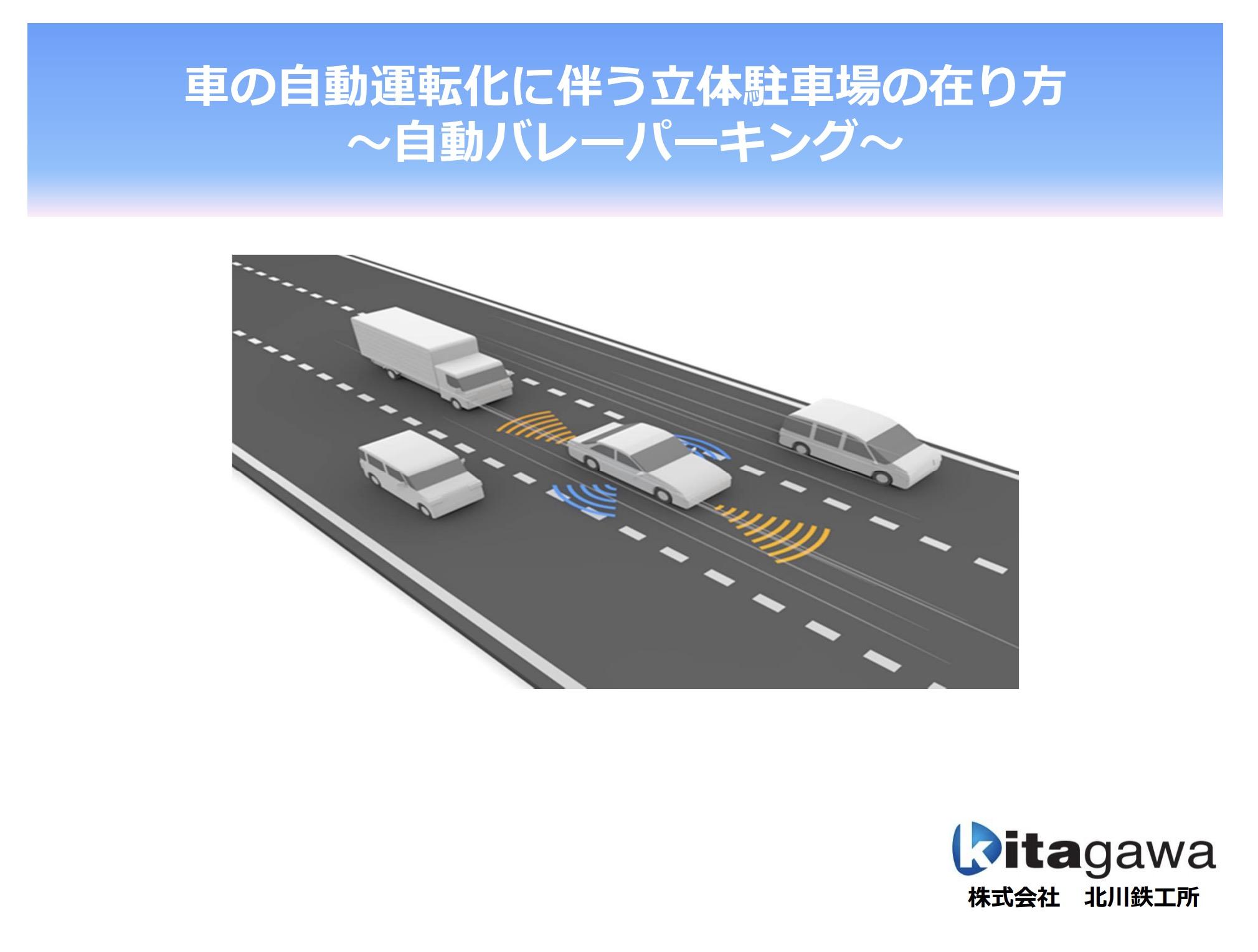 車の自動運転化に伴う立体駐車場の在り方について。この先 クルマの自動バレーパーキングはどんどん進化していくのは間違いありません。そこで自動バレーパーキングに対応できる駐車場をkitagawaから提案いたします。「kitagawaスーパーロングスパンタイプ」。kitagawaの最新駐車場「スーパーロングスパンタイプ」についての資料をPDFにてご覧ください。